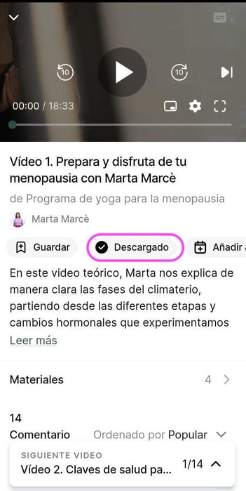 Los vídeos descargados se almacenan en Cuenta → Descargas y estarán disponibles offline durante 30 días. Al cumplirse el plazo, se te preguntará si deseas renovar la descarga. Para hacerlo, debes tener acceso a WiFi nuevamente.
