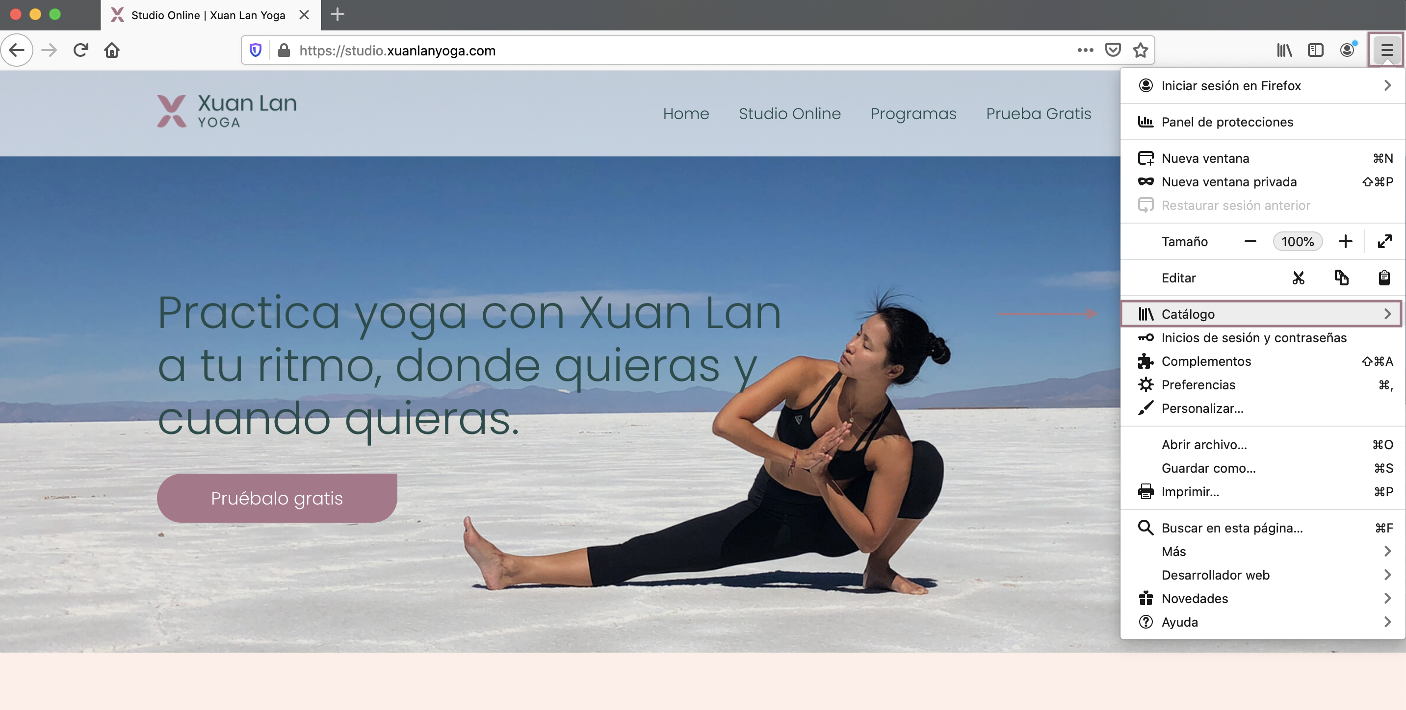 - Haz clic en el menú ‘Herramientas’ (Tres rayas) en la parte superior derecha del navegador y selecciona ‘Catálogo’.