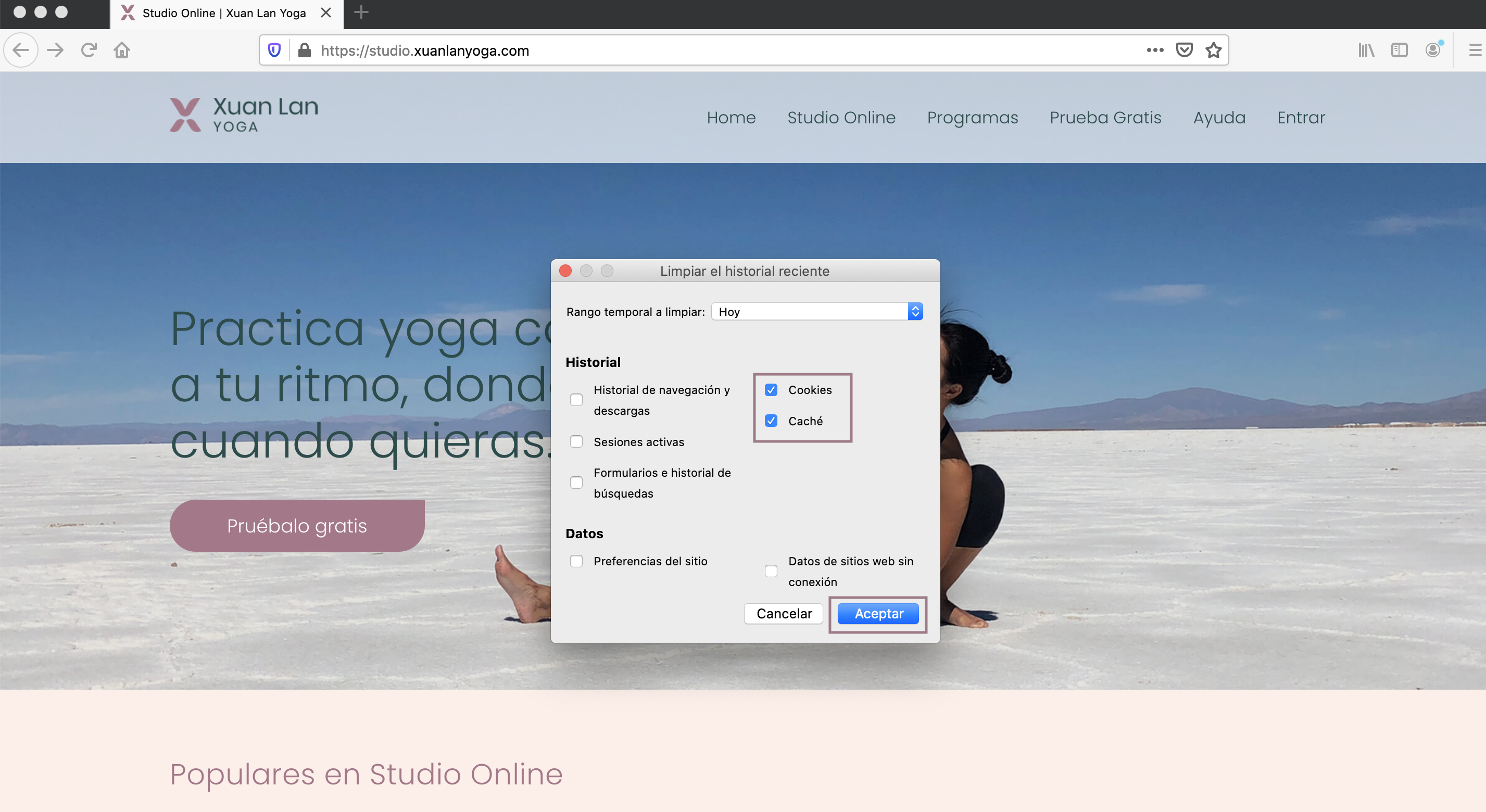 - Selecciona al menos Cookies y Caché y finalmente haz click en "Aceptar".