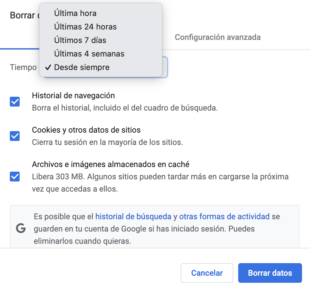 - Finalmente haz click en "Eliminar ahora" o "Borrar historial".