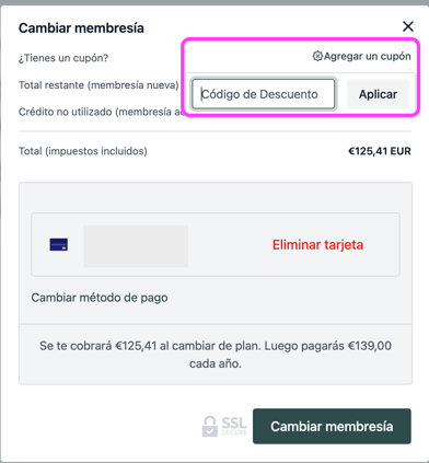 • Si tienes un cupón de descuento, podrás aplicarlo en este paso. Verifica que se haya aplicado correctamente antes de confirmar el cambio.