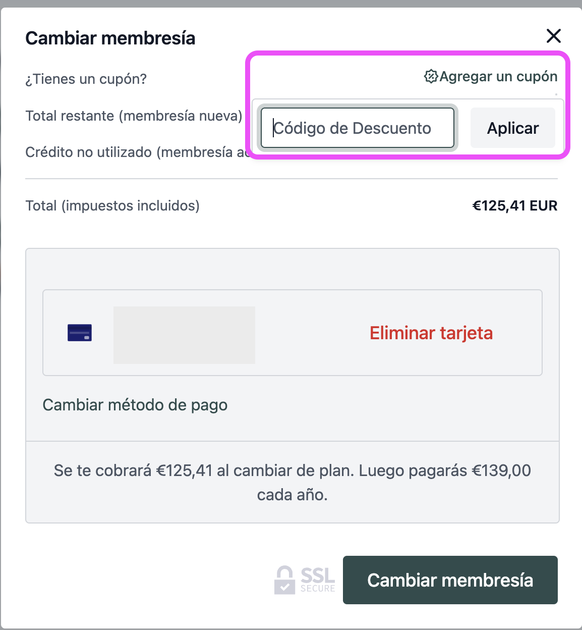 - Si tienes un cupón de descuento, podrás aplicarlo en este paso. Verifica que se haya aplicado correctamente antes de confirmar el cambio.