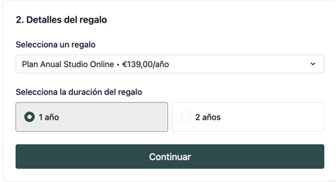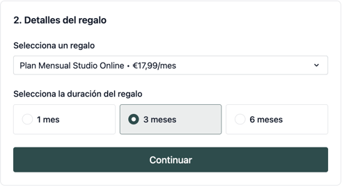 - Selecciona la opción de suscripción desde el menú desplegable. En caso de elegir el plan mensual, elige la cantidad de meses (1, 3 ó 6). En caso de seleccionar la membresía anual puedes regalar 1 ó 2 años: