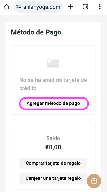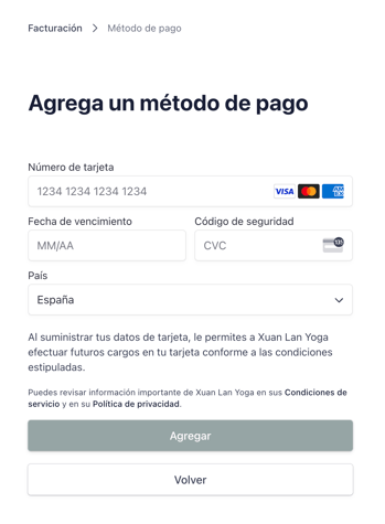 • Si no tienes ningún método añadido, selecciona Agregar método de pago e ingresa los datos.