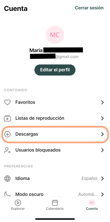La función de descarga permite descargar y guardar videos dentro de la aplicación. Esos videos se pueden ver sin conexión a Internet y en modo offline, ingresando a Cuenta:
