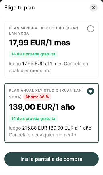 Busca "Xuan Lan Yoga" en App Store (Apple) o Play Store (Android), o accede desde tu móvil o tablet. - Elige el plan de suscripción