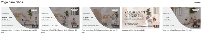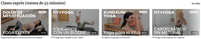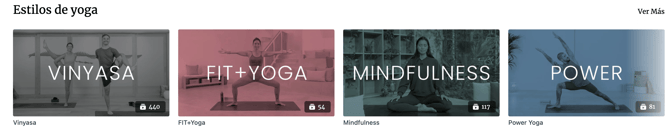 Vídeos organizados por estilo de práctica: vinyasa, hatha, FIT+Yoga, relajante, meditación, entre otros. Puedes combinar esta categoría con los filtros para ajustar tus resultados.