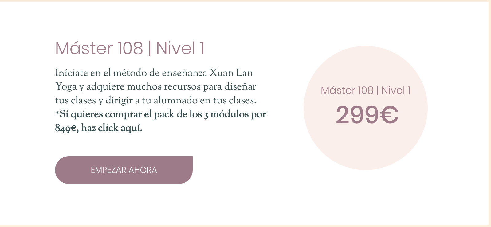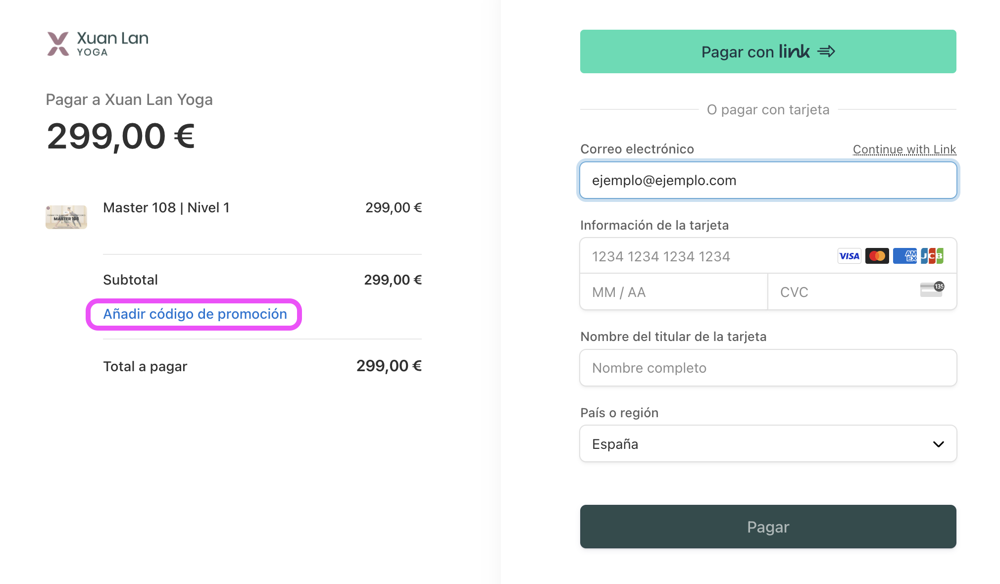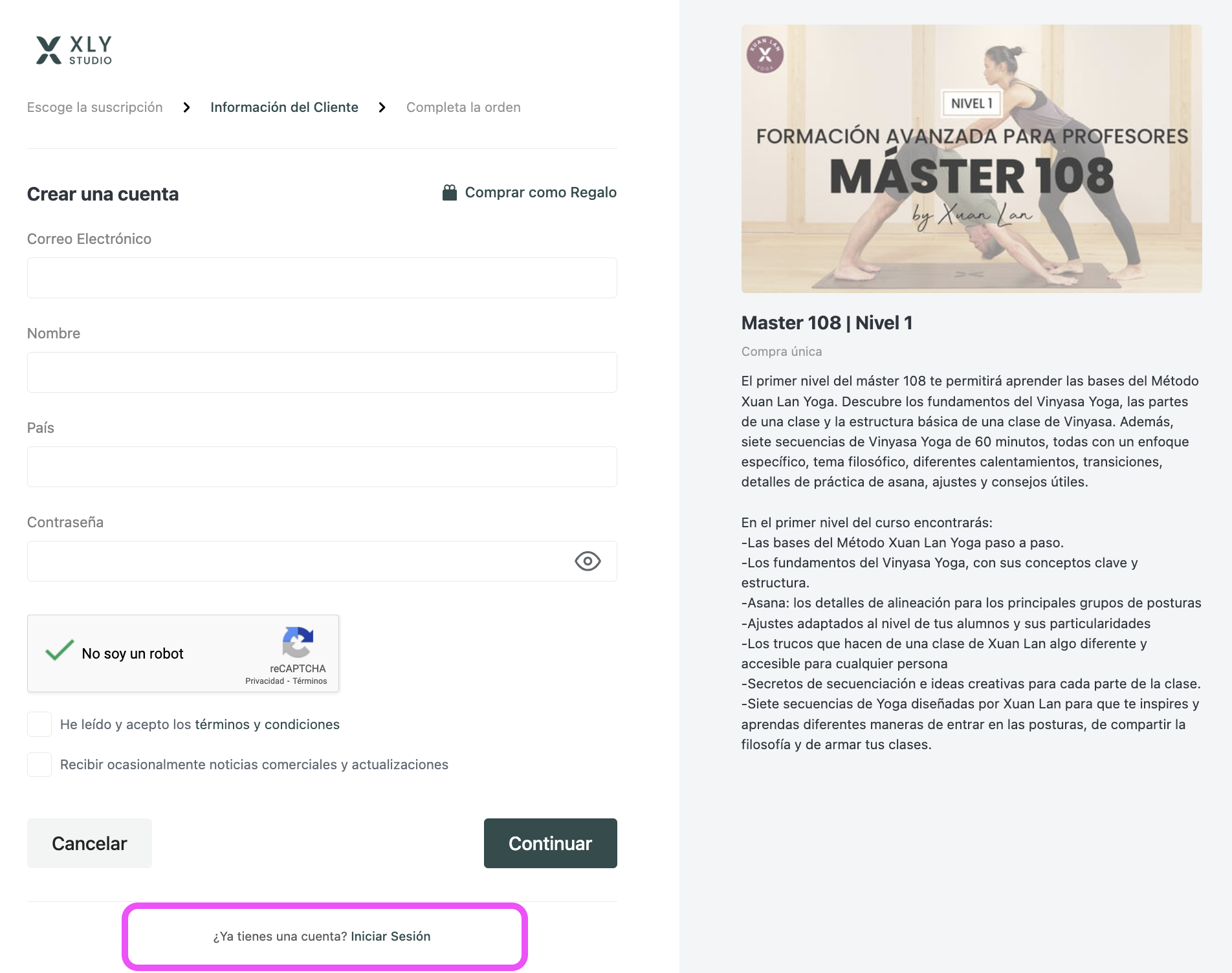 Solo puedes comprarlo desde la web xuanlanyoga.com. Desde el menú selecciona “Máster 108” y elige si comprar el pack completo o módulos sueltos. Crea tu cuenta o inicia sesión, completa los datos de pago y haz clic en Pagar.