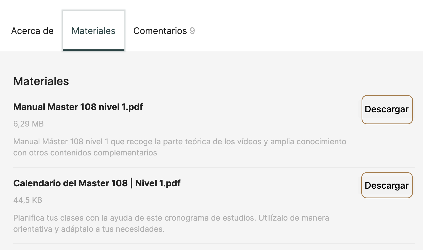 Si accedes desde un ordenador, el manual e-book está dentro de la sección MATERIALES, debajo de los vídeos: