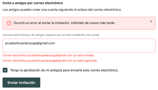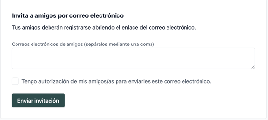 - Enviar invitación por correo: Ingresa la dirección de email de tu amigo directamente desde la plataforma. Si son varios, sepáralos con comas.